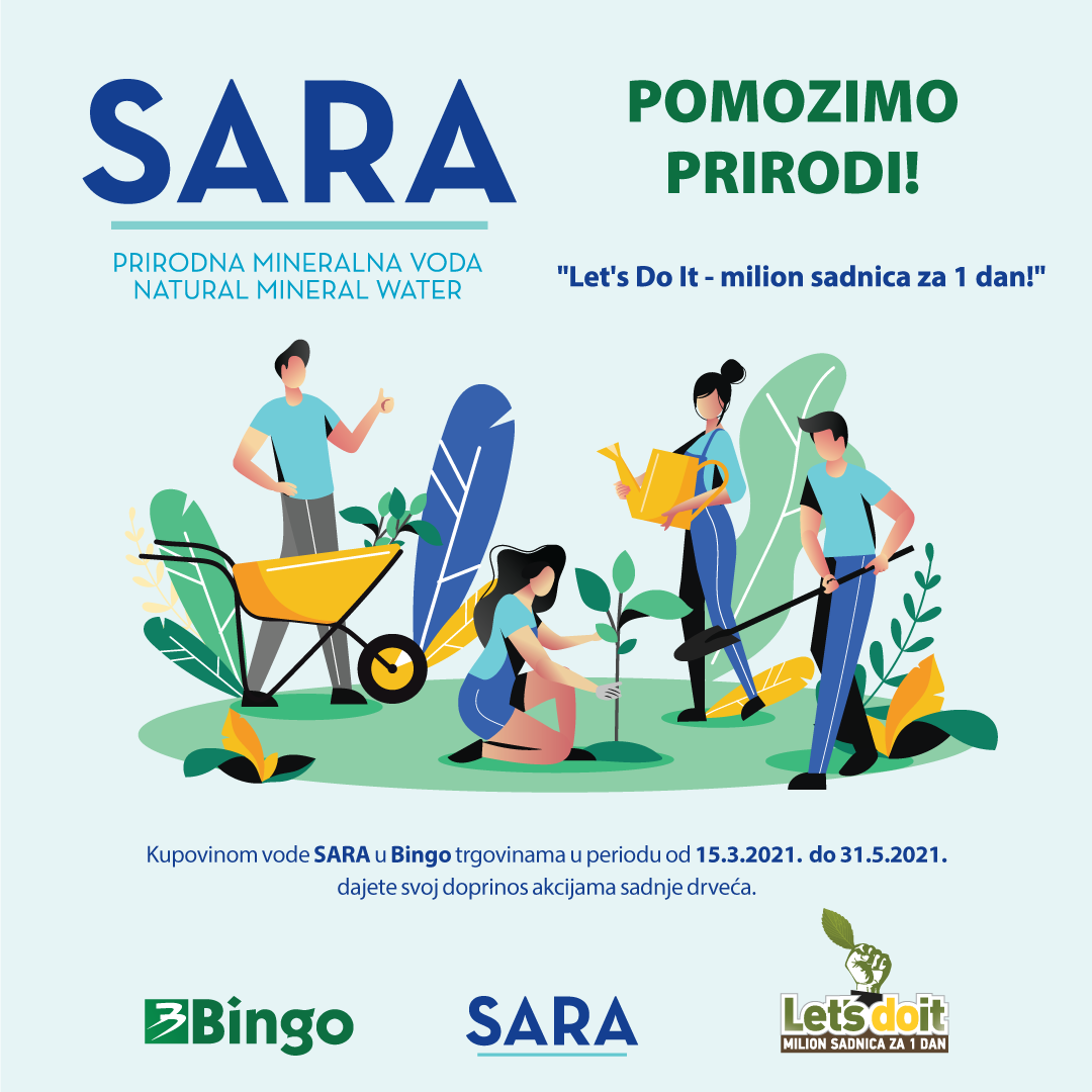 Prirodna mineralna negazirana voda SARA, koja dolazi iz čistog, netaknutog krajolika srednje Bosne, i ove godine s ponosom podržava najveću volontersku akciju sadnje drveća u BiH “Let’s Do It – milion sadnica za jedan dan”. Dio prihoda od prodaje vode SARA u Bingo trgovinama od 15. marta do 31. maja bit će izdvojen za velike akcije pošumljavanja kojima se želi pomoći očuvanju okoliša u BiH te boljoj kvaliteti života.